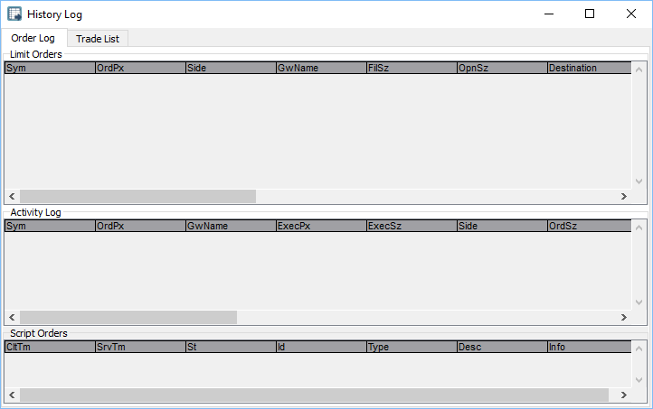 1. Right-click a column heading, such as Symbol, MarketName, PriceOrder, Side, State, SizeOrder, SizeFilled, SizeOpen, Gateway, Destination, AutoCancel, OrderID or ViaApi in the Limit Orders section, or ClientTime, ServerTime, State, ScriptID, or ScriptType in the Script Order section of the History Log window.