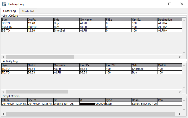 The Order Log window has three components: Limit Orders, Activity Log, and Script Orders.