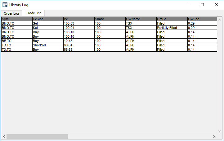 The History Log window contains two sub-tabs: Order Log and Trade List.