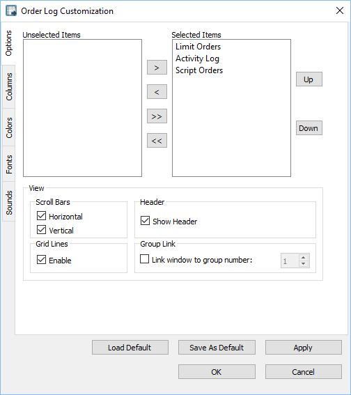 To make changes to the Order Log settings, right-click anywhere in the blank space of the Order Log, and then click Order Log Customization Dialog or press Ctrl + O, to open the Order Log Customization window. This window displays four tabs on the left: Options, Columns, Colors, Fonts, and Sounds.