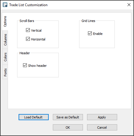 To make changes to the Trade List settings, right-click anywhere in the blank space of the Trade List, and then click Trade List Customization Dialog or press Ctrl + T, to open the Trade List Customization window. This window displays four tabs on the left: Options, Columns, Colors, and Fonts.