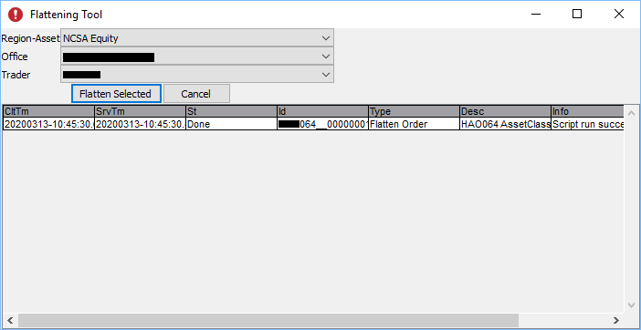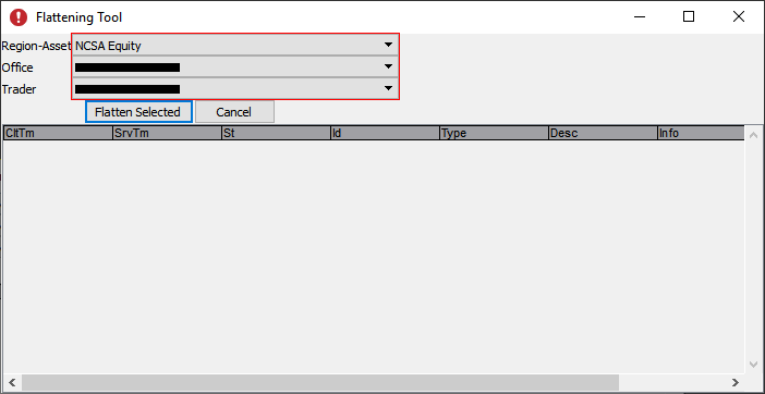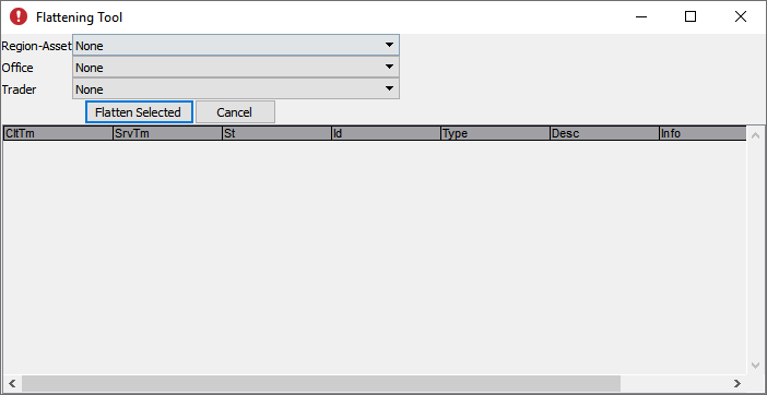 The Flattening Tool can be used to flatten positions by market region, asset class, office, and trader. It sends an order to immediately close out one or more positions.