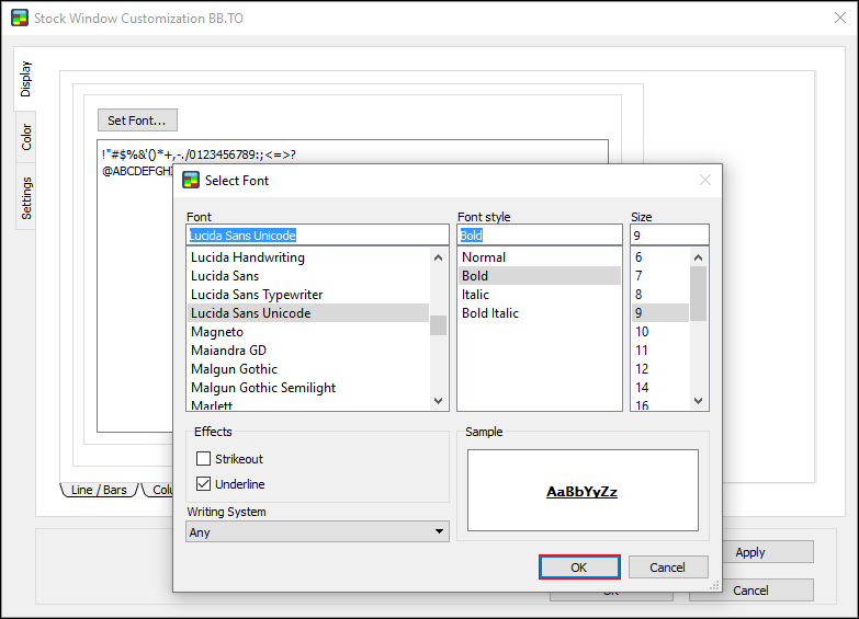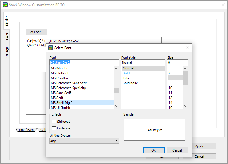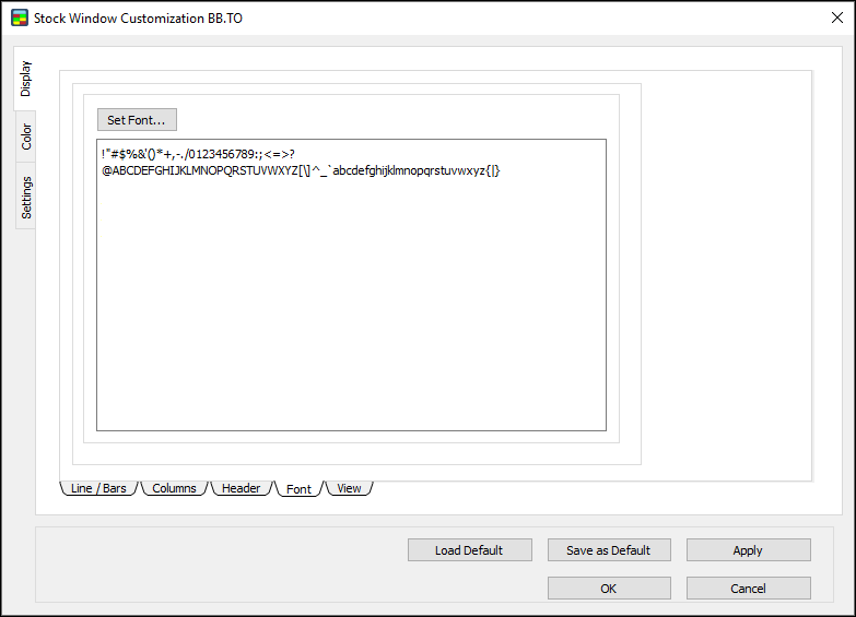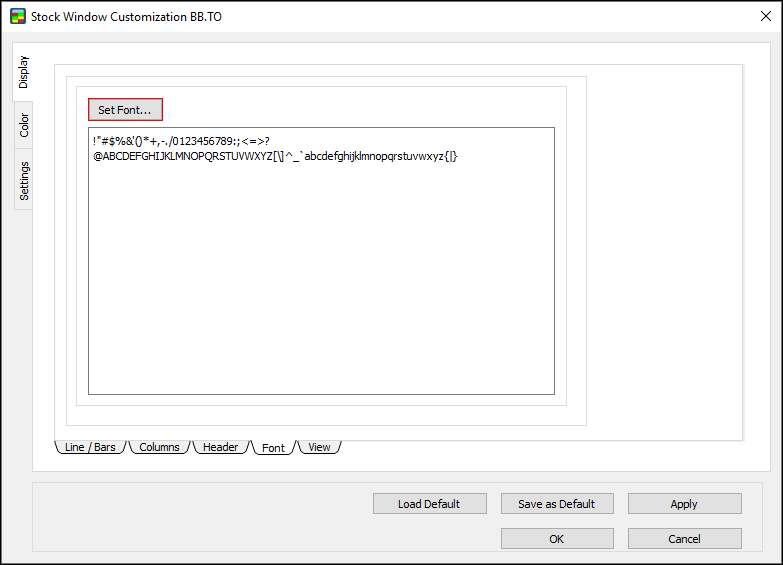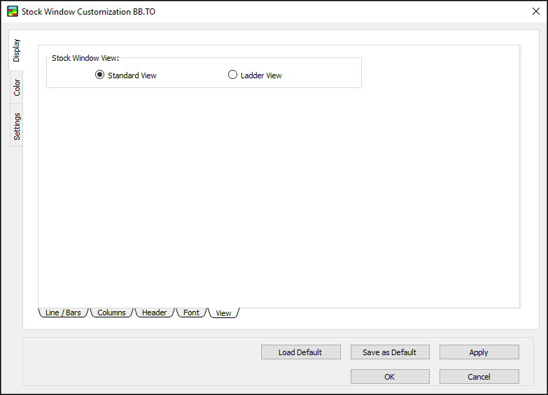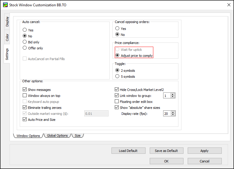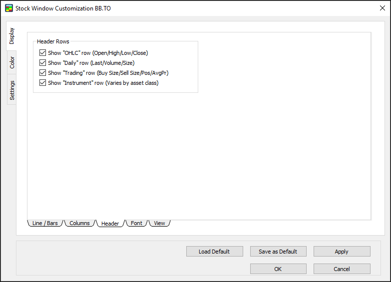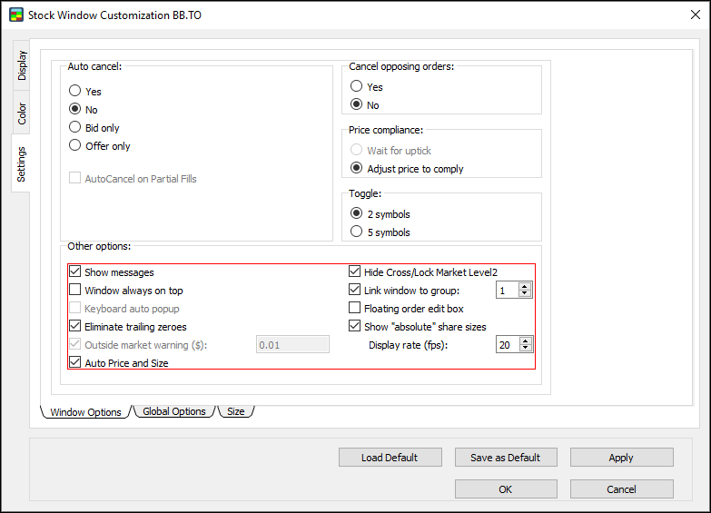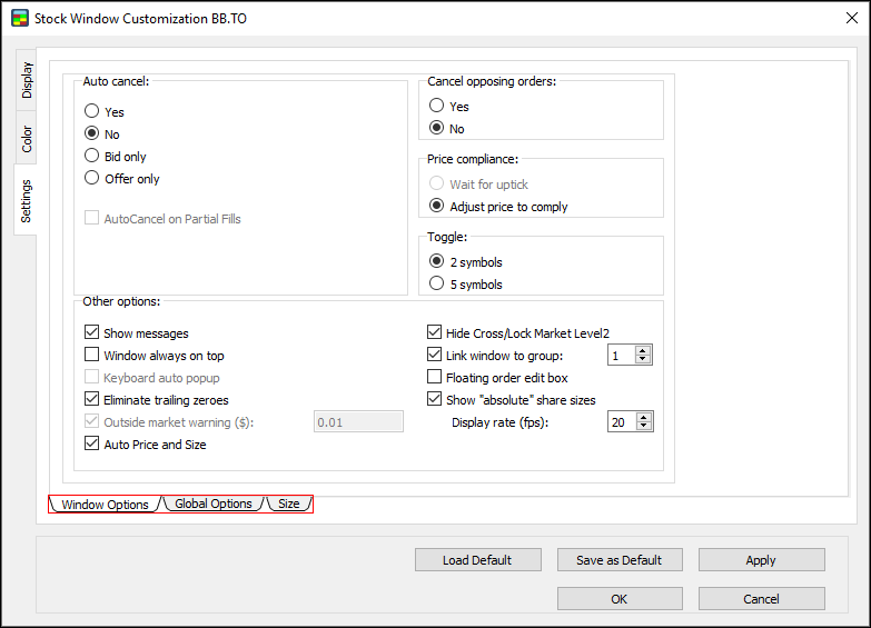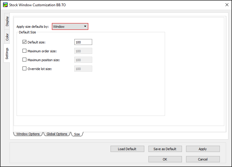 Use the Settings window to set window options, global options, and size for the Stock Window.