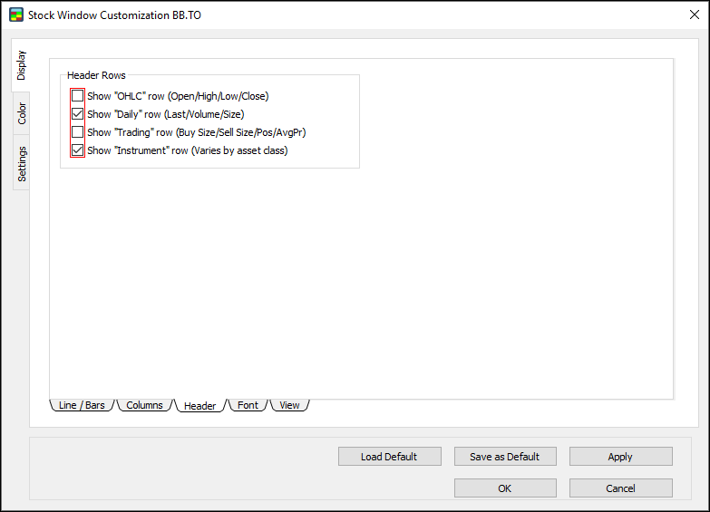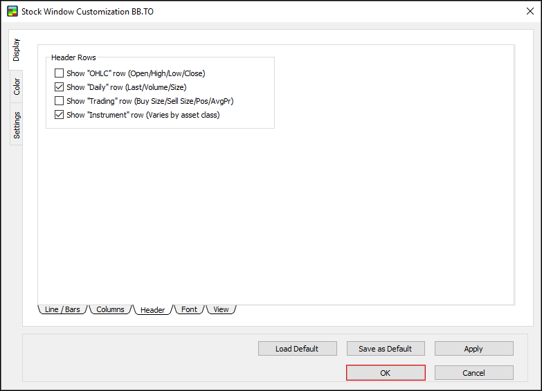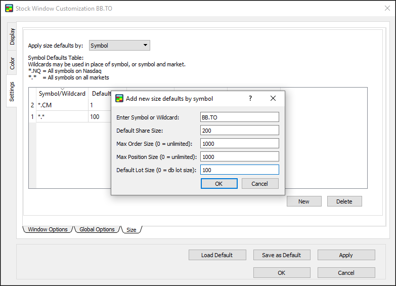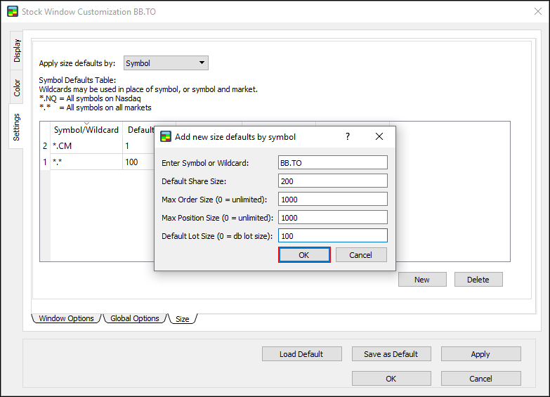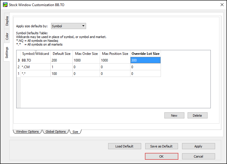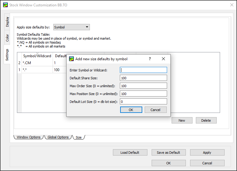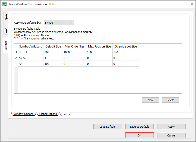New: the symbol defaults table now syncs across all open instances of the Stock Window. Simply press a hotkey for an order, and then press Ctrl + NumPad to set the share size. The next time you open Customization for an open instance, the table will be populated with a new row for each symbol.