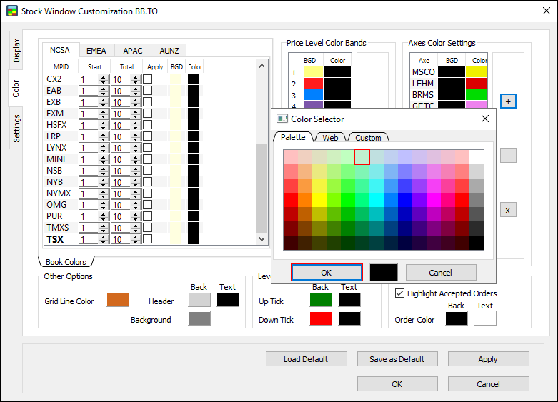 1. In the Color window, under Level1 Colors, double-click the Back (for background) color box next to Up Tick or Down Tick.
