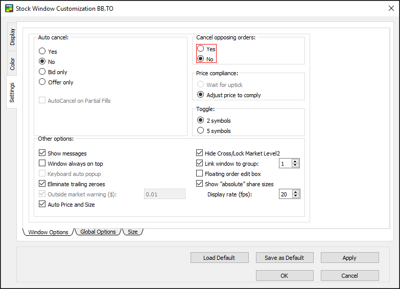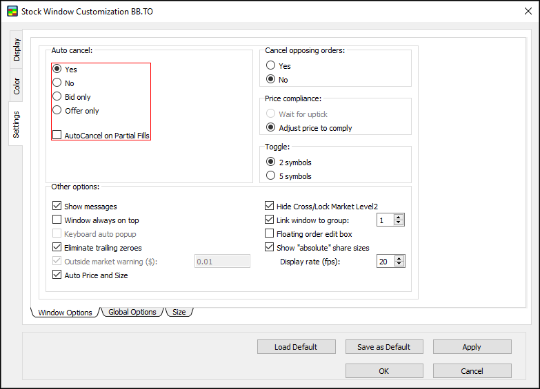 - In the Window Options window, under Auto cancel, click Yes, No, Bid only, or Offer only to set the auto cancel options: