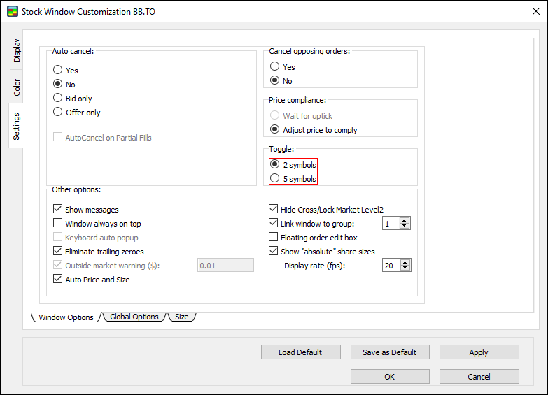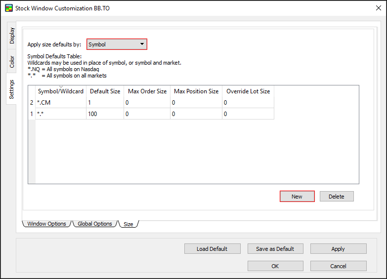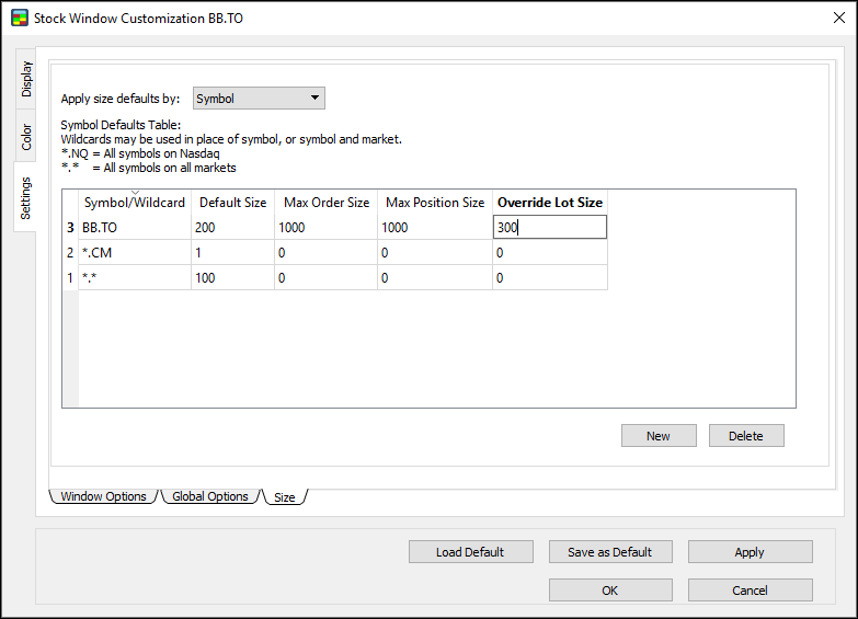- Symbol: if this option is clicked, the default order size applies to all orders on a certain symbol.