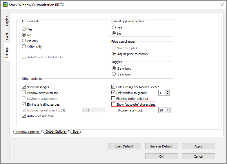 - Show “absolute” share sizes: if this option is selected, the true size of a book appears, showing odd lots when they are present. This does not apply to Lv1 size in the header.