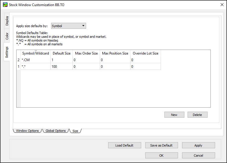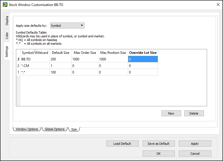 Use the symbol defaults table to set the default order size, maximum order size, and maximum position size for a certain symbol or wildcard.