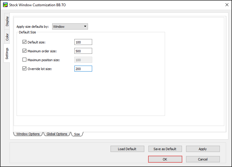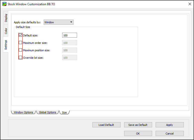 - Window: if this option is clicked, the default order size links to a certain window, but symbols open in other windows are not affected.