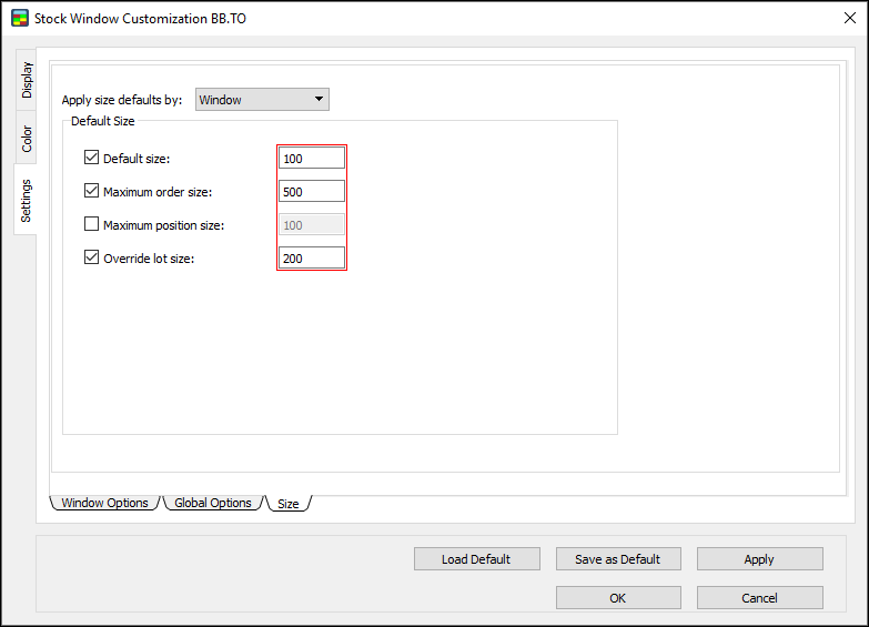 2. Select or clear the check boxes for Default shares, Maximum order size, Maximum position size, and Override lot size.