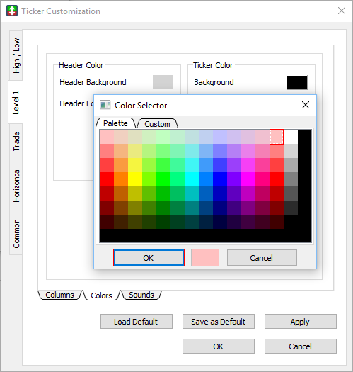 要对跳价器窗口进行个性化设置,在窗口的任何地方邮件单击,选中Ticker Customization。在个性化设置窗口的左边有5个主标签:High/Low, Level 1, Trades, Horizontal,和Common一般设置。