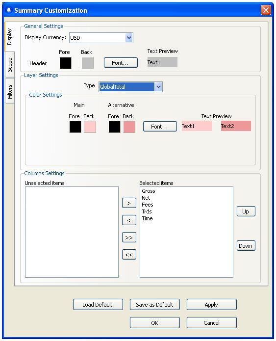 (A) GENERAL SETTINGS: This is where user sets the currency used for display and Header’s Foreground and Background color plus text font. *Note: The default currency displayed in Summary window is USD and the user can select to change it in this customization window. However, other PPro 8 tools will only display in local currency specific to the market the trader is trading on.