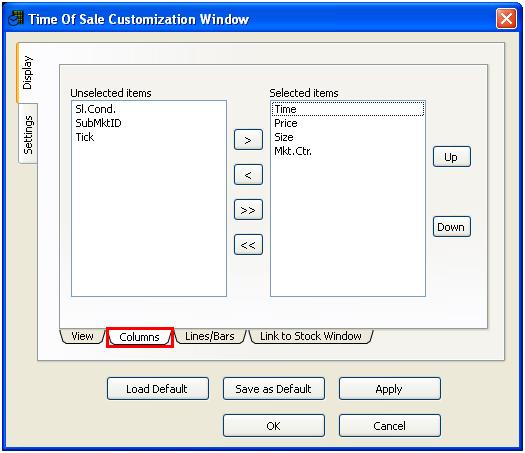 2.1a) DISPLAY Tab: Contains 4 sub-tabs; View, Columns, Lines/Bars, Link to Stock Window.