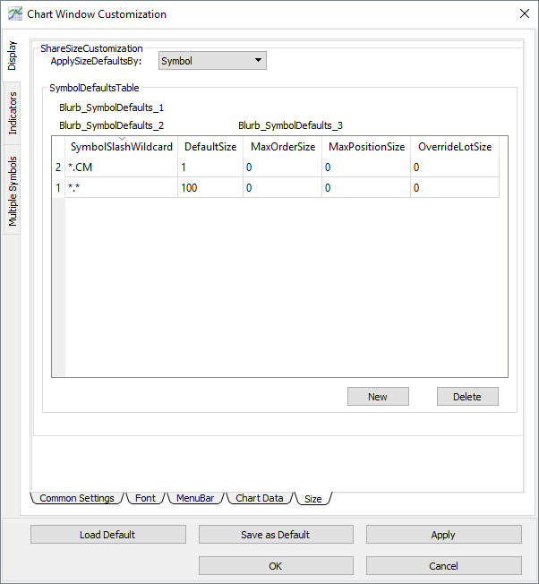To make changes to the Chart Window settings, right-click anywhere in the Chart Window, and then click the Customization Dialog menu item to open the Chart Window Customization window. This window displays three main tabs on the left: Display, Indicators, and Multiple Symbols.