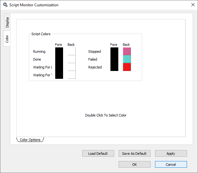 To make changes to Script Monitor settings, right-click in the Script Monitor, and then click the ScriptMonitorCustomization Dialog option to open the Script Monitor Customization window. This window displays two main tabs on the left: Display and Color.