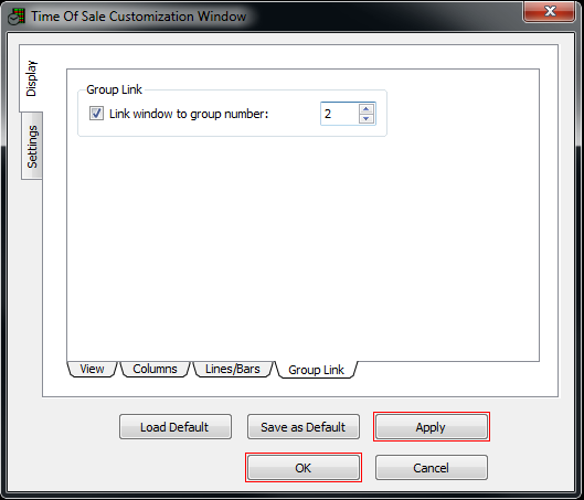 Use the Group Link window to link the Time of Sales window to other tools, such as the Stock Window and the Chart Window.